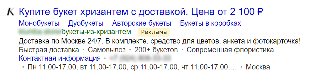 Для каждого типа букетов в Key Collector мы собрали ключевые слова и минус-фразы, сгруппировали их и написали релевантные поисковые объявления под каждую группу объявлений. В заголовке обязательно указывали минимальную стоимость букета чтобы отсечь тех, кто ищет дешевые цветы, а также делали акцент на бесплатные подарки, которые клиент предлагает вместе с доставкой букетов: анкета, фотокарточка и средство для продления жизни срезанным цветам.