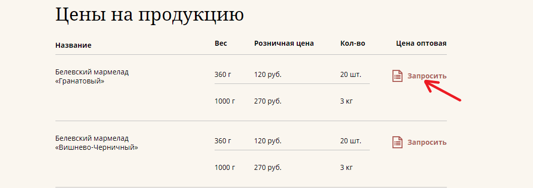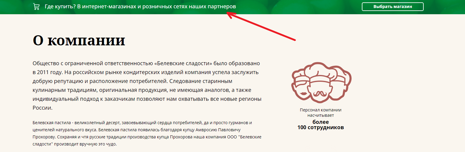 Запросов «купить оптом» было очень мало, так как оптовые покупатели чаще всего заходят на сайт напрямую и ищут нужную информацию о сотрудничестве или запрашивают у производителя. Они направлялись на страницу «Продукция оптом». Запросы розничных покупателей типа «купить белевскую пастилу в туле» и «белевский зефир цена» направлялись на страницу с фирменными магазинами.